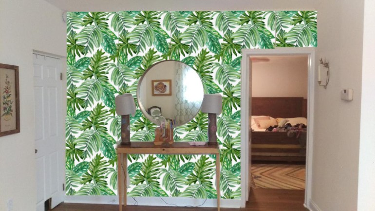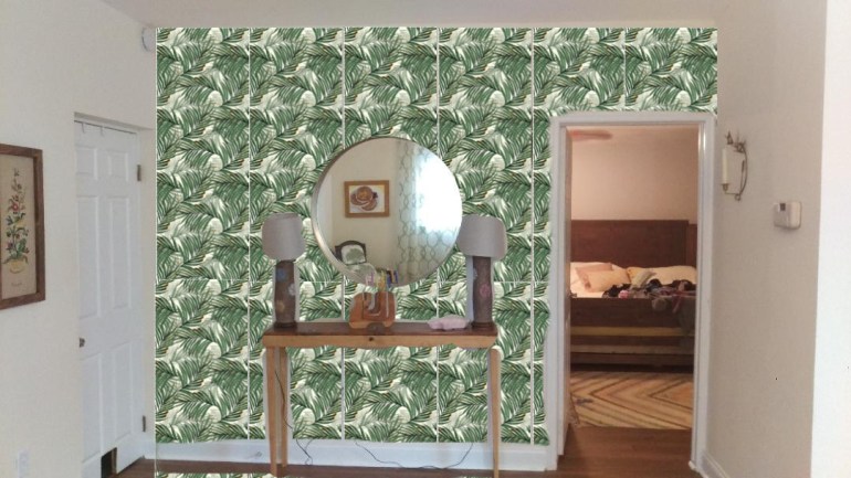 The wallpaper samples were about $11 and took about a week to get to me but I have to say they’re life savers. Once you see a sample on the wall it makes a big difference. If it’s big enough you can tell right away if it will work. I have so many samples now I swear I could wallpaper a small bathroom with them. I still couldn’t decide if I like the fern print so Robbie photoshopped some designs onto a picture of that wall. If you know how to do this I HIGHLY SUGGEST YOU DO! It’s the best way to get an idea of what it will look like in the space and it’s FREE!! I spent so much on samples I’ll never do that again.