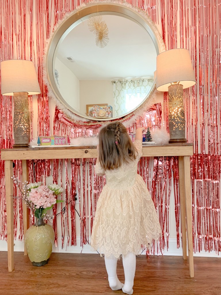 We have one teeny accent wall in our dining room that houses two former DIY projects: the console table and the mirror we sprayed gold. It’s quickly become the most worked over spot in our house and we’re not done yet! After putting up pink tinsel on this wall for Christmas we decided this space needed something bold and fun all year round.