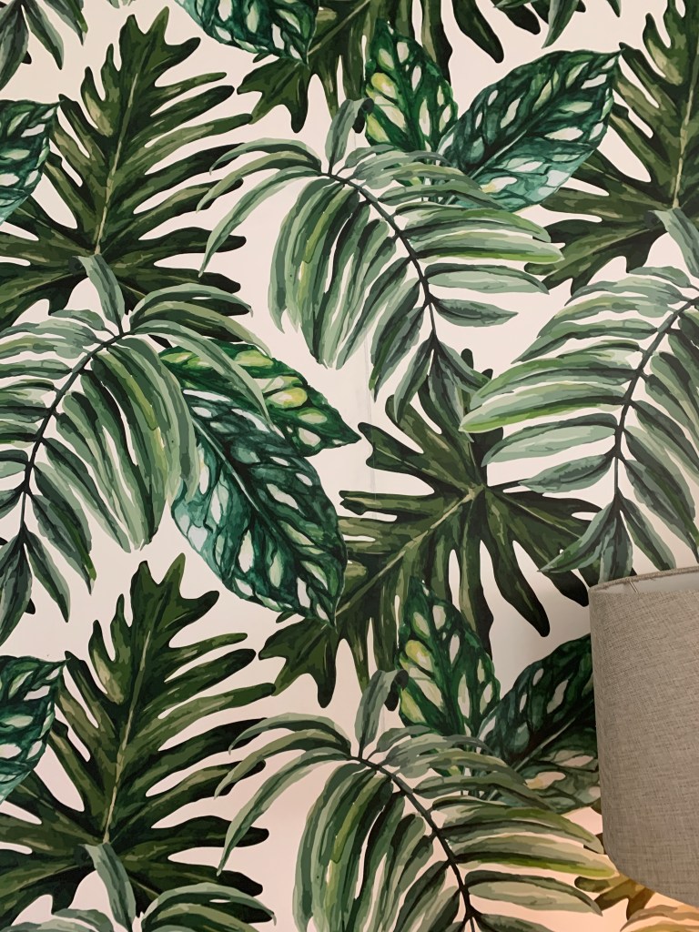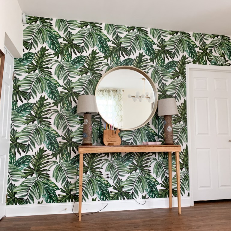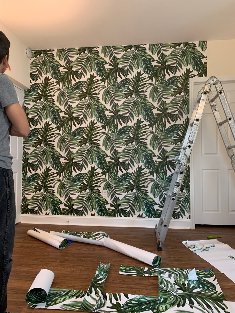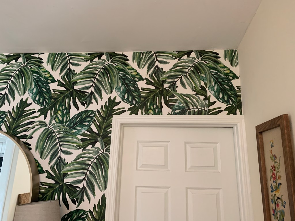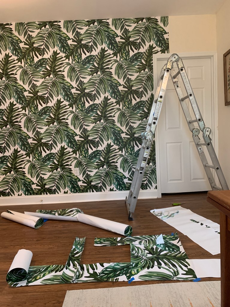 We were so excited to get the 4 rolls of wallpaper during the quarantine – there’s no better project than wallpapering a wall when you’re stuck inside. We got our peel and stick wallpaper from https://musewallstudio.com/ She delivered it fast and even helped me with a credit card mistake I made. Check out her great site if this is something you want to do. There are also sooo many options on Home Depot’s website and of course Etsy.