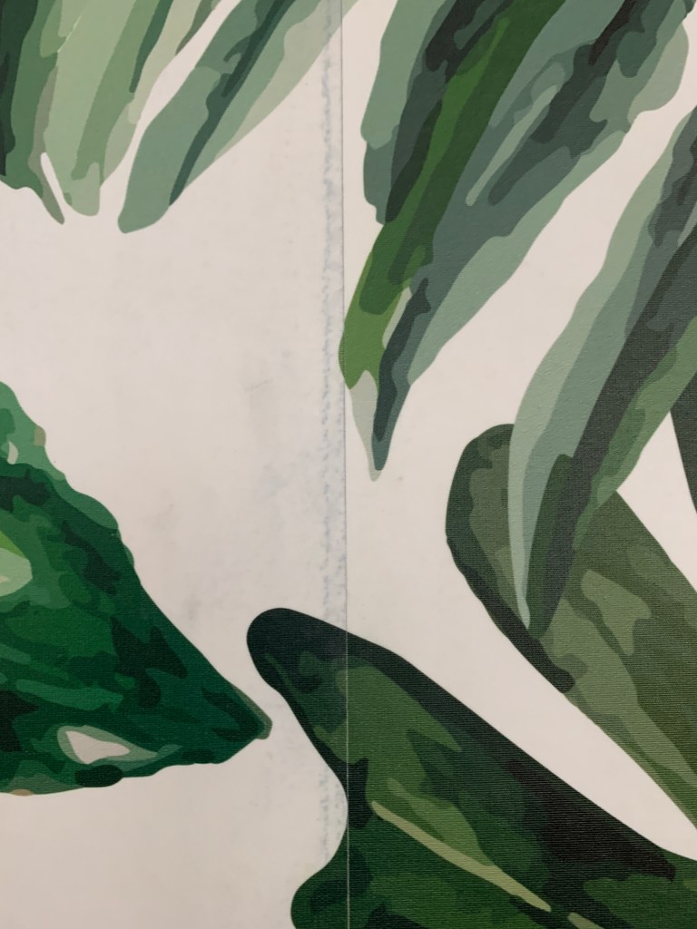 We learned a few things about removable wallpaper that we’ll pass on to you. One is to go left to right and it’s best to measure the width of the panel and draw a LIGHT pencil line to line up the edge with. I say light because we drew ours very dark and surprise! It popped through the paper. You can see the dark pencil line even after we erased it. The paper is A LOT more see-through than we thought. You can even see the pink paint swatch I painted under the white area. Fortunately the pattern is so loud your eye isn’t drawn to the pencil marks – so phew but beware!