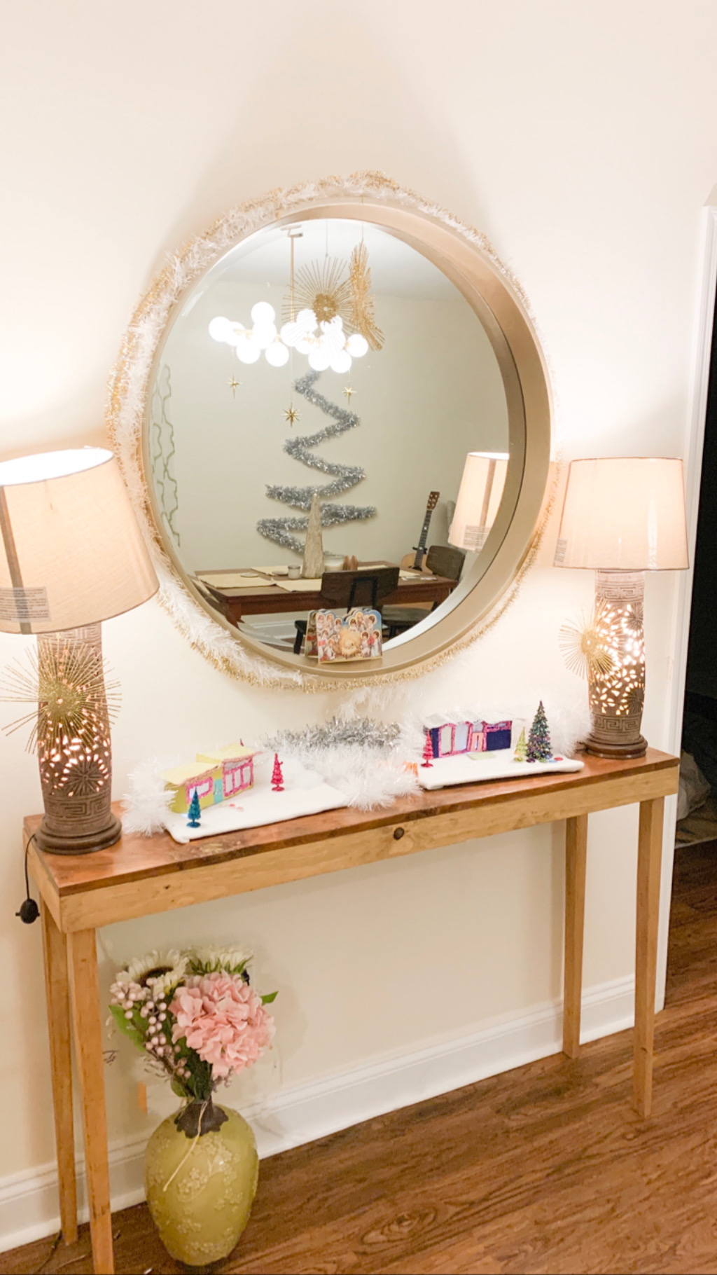 We have one teeny accent wall in our dining room that houses two former DIY projects: the console table and the mirror we sprayed gold. It’s quickly become the most worked over spot in our house and we’re not done yet! After putting up pink tinsel on this wall for Christmas we decided this space needed something bold and fun all year round.